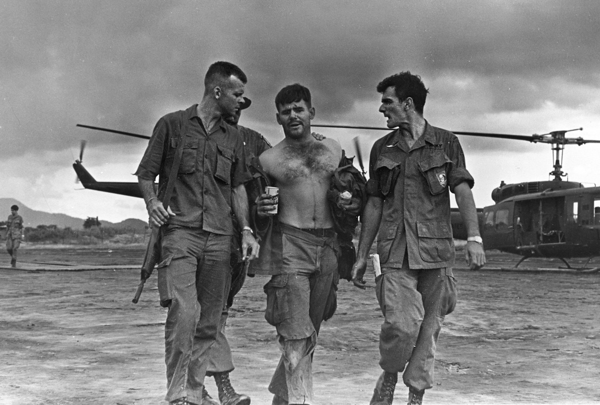 U.S. Army Sgt. Gary M. Rose is helped from a helicopter landing area after Operation Tailwind, 1970. (U.S. Army photo by Ted Wicorek)