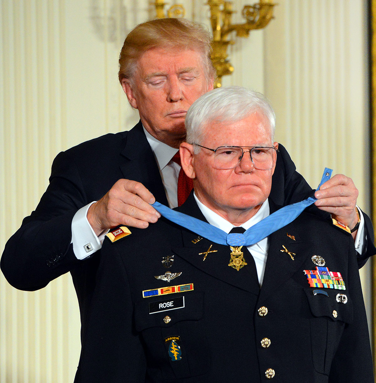 President Donald Trump places the Medal of Honor around the neck of Capt. Mike Rose, during an Oct. 23, 2017 ceremony at the White House, in Washington, D.C. (U.S. Army photo by C. Todd Lopez)