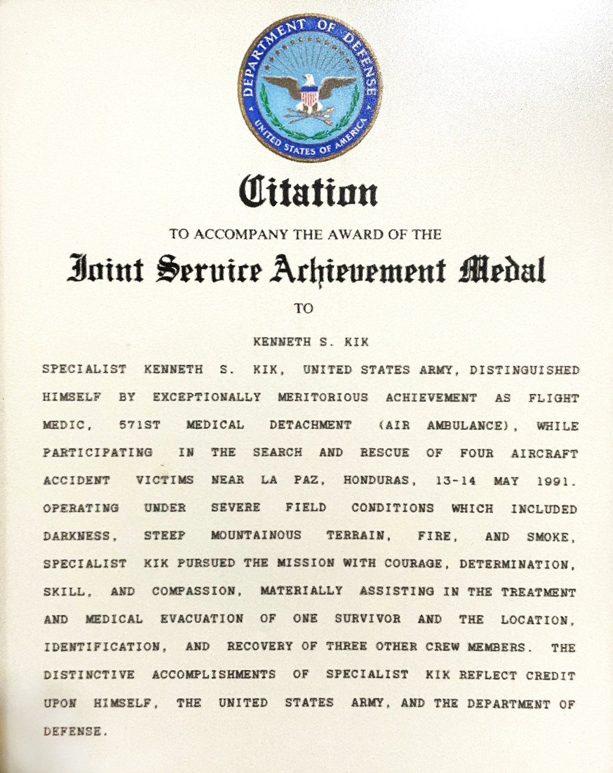 Along with Ken Kik, those JSOC/7th Special Forces Group personnel who accomplished what two attempts by conventional forces QRF could not do the SECWAR at the time issued this impact award in July 1991. The JSAM is a Secretary of War authorized award. It overshadows individual Achievement awards from all Services and is an award commonly associated with JSOC personnel / Special Mission Units. The orders show Kik and a captain from 7th Group and three others, all apparently JSOC personnel. (Credit: Ken Kik)