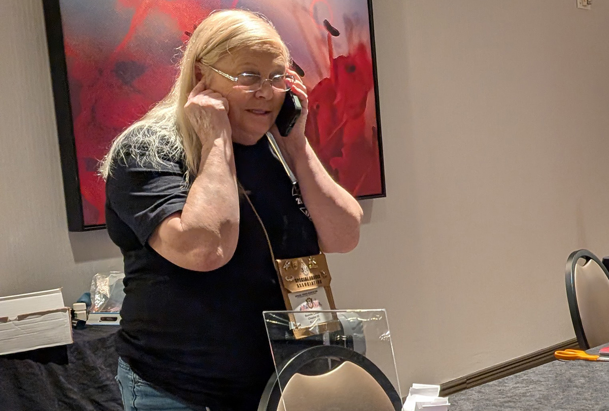 Bonnie Cooper taking care of business at the SFA registration desk.
