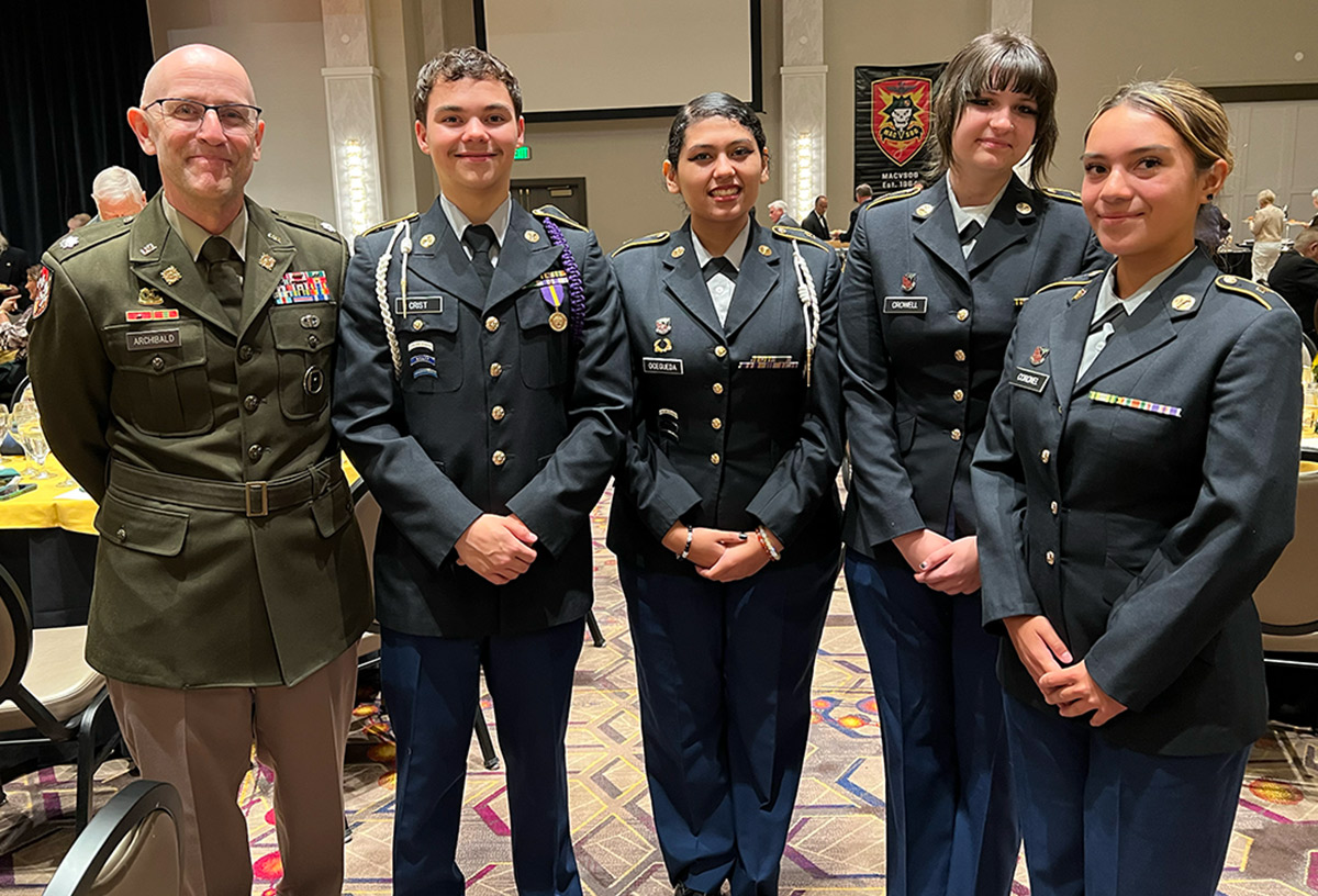 Desert Oasis High School JROTC—LTC Archibald (Ret.), Cadet Crist, Cadet Ocegueda, Cadet Crowell, and Cadet Coronel.