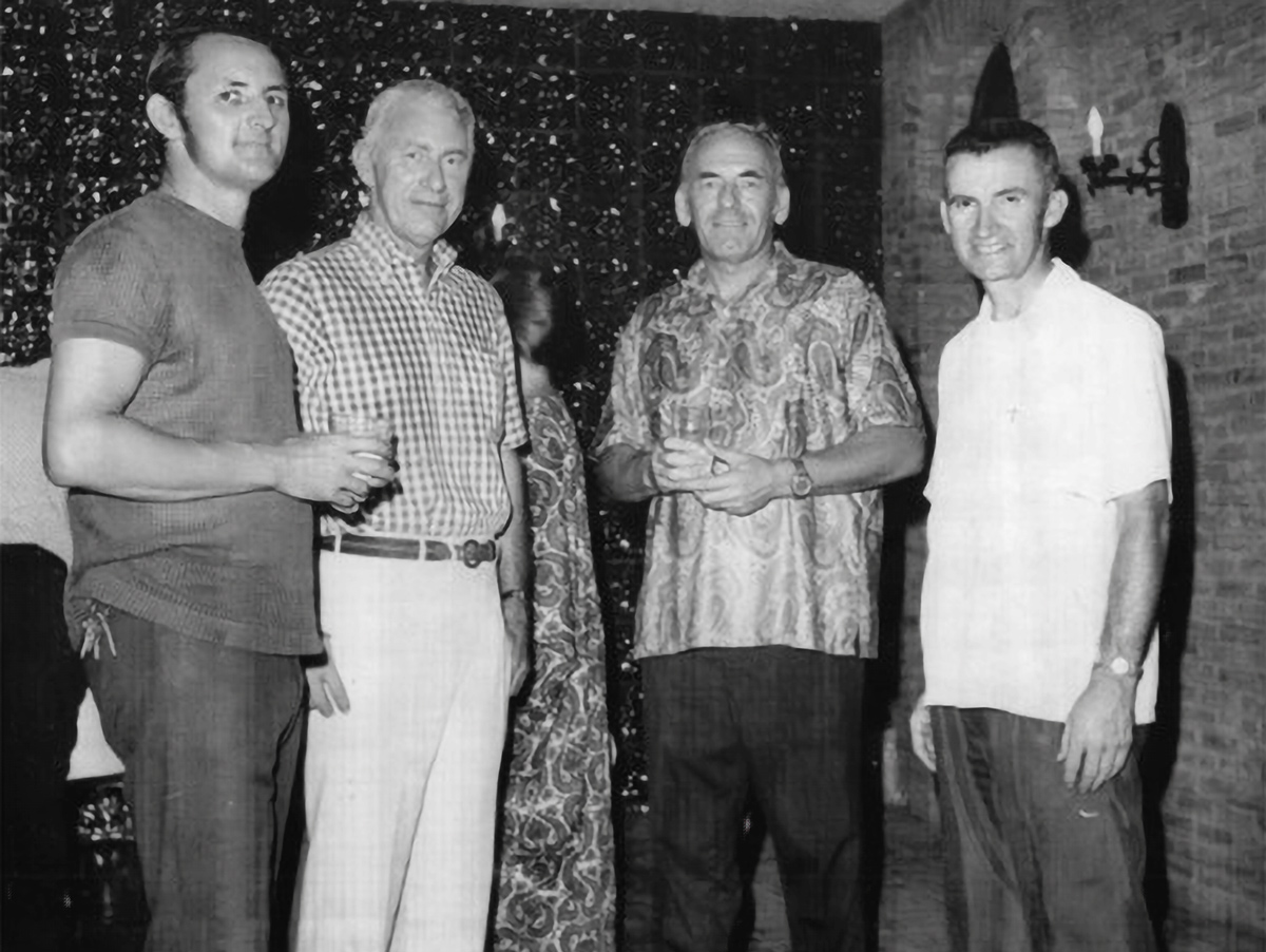 The late International Voluntary Services and USAID volunteer Larry Woodson with (then) US Ambassador to Laos Charles Whitehouse, Bill Gill, and Father Lucien Bouchard, of the Oblates of Marry Immaculate, at a US Embassy Party sometime between September 1973 and April 1975. (Photo courtesy Larry Woodson)