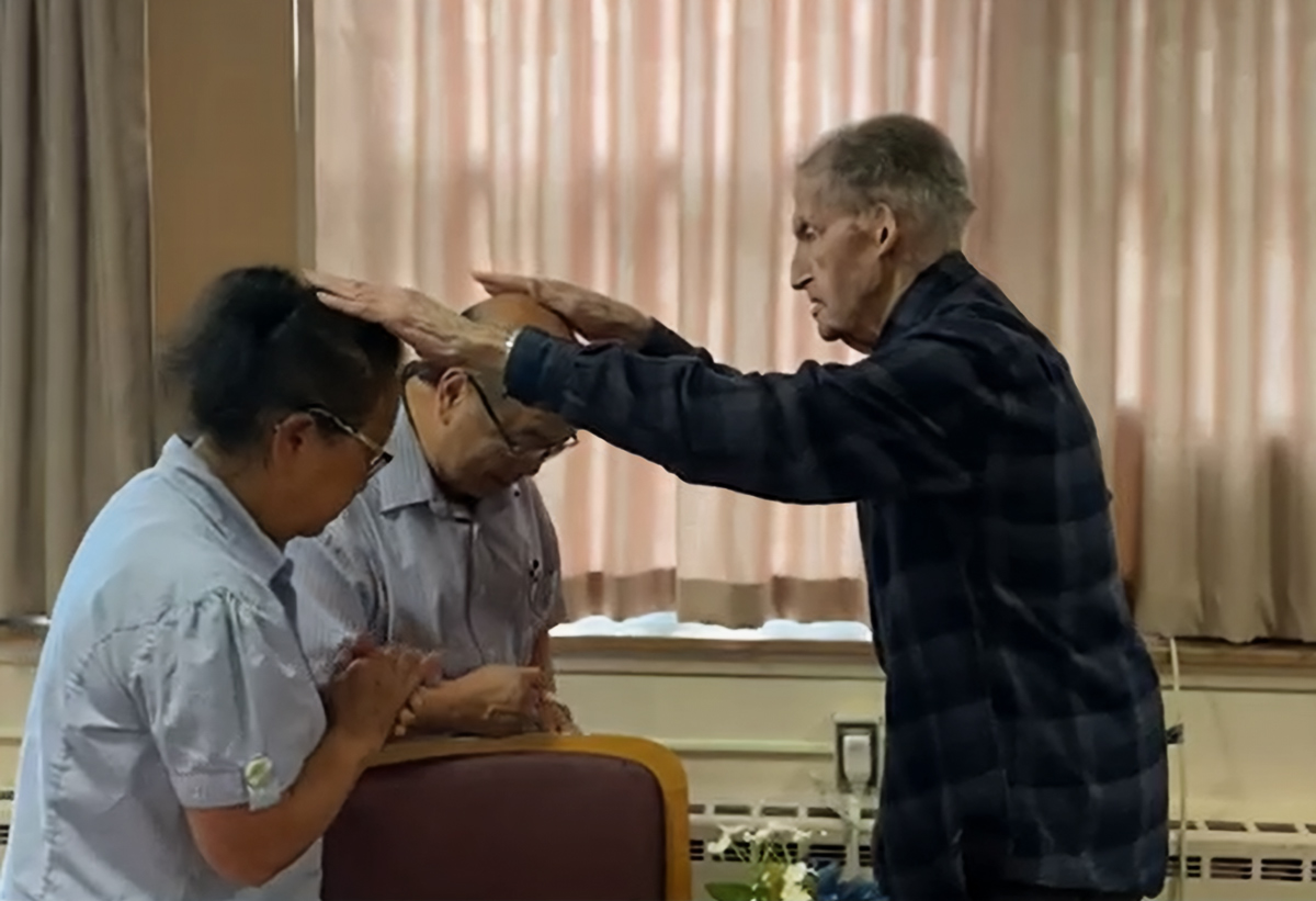 Father Lucien Bouchard, at the retirement home of the Oblates of Mary Immaculate in Tewksbury, Mass., blessing Xia Vue Yang, co-founder of the Lao, Hmong, American Veterans Association of Sheboygan, Wisc., and his wife Pa Vang Yang. (Photo courtesy Xia Vue Yang)