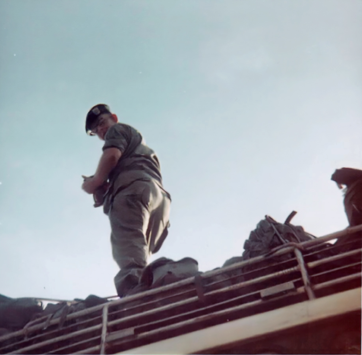 SFC Donald “T-bomb” Tannenbaum (Intel SGT) makes last minute adjustments to our equipment on top of the bus for the two-day ride to Nam Pung Dam.