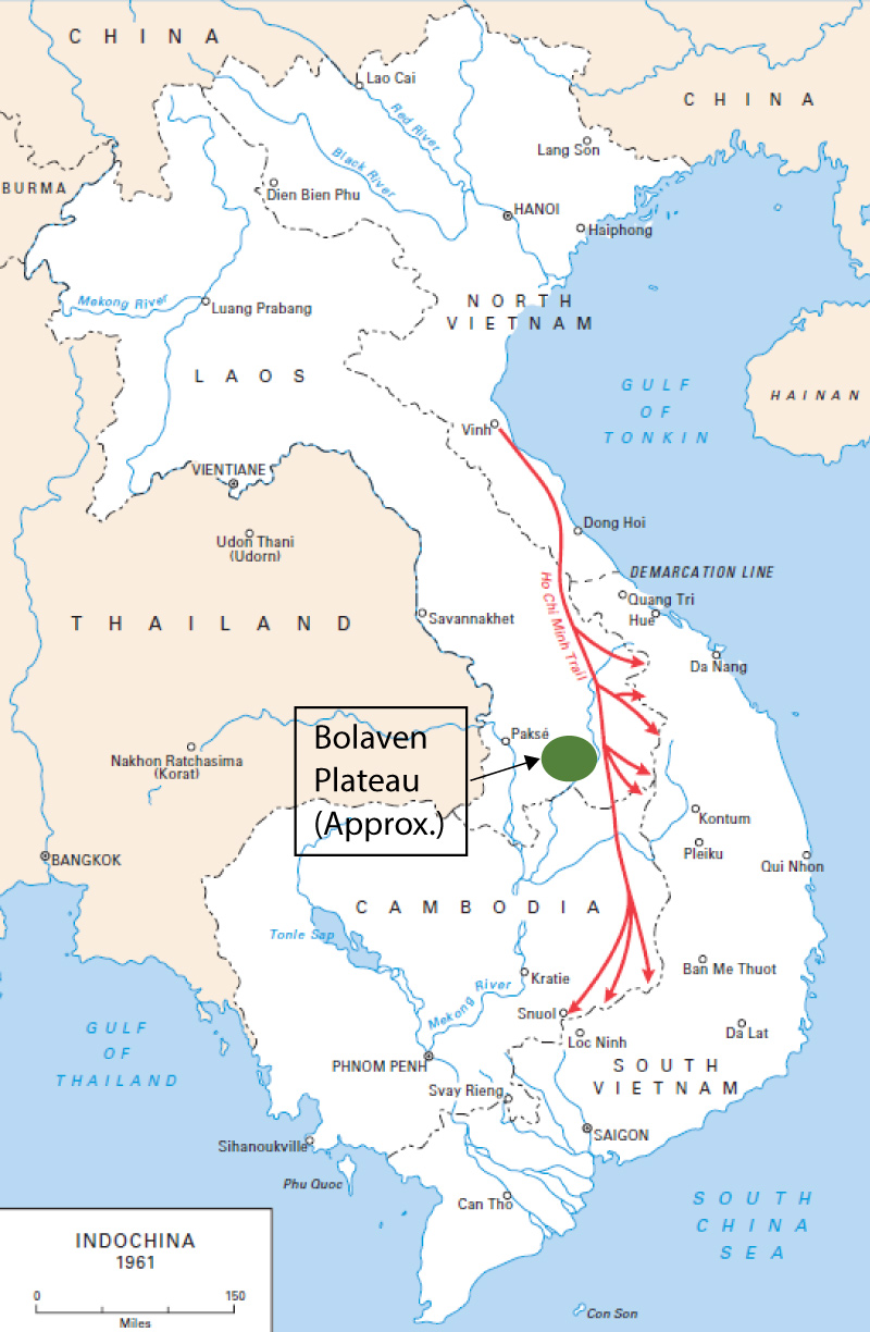 Ho Chi Minh Trail network. Location of the Bolaven Plateau relative to the Ho Chi Minh Trail. (Map U.S. Army with addition of the Bolaven Plateau marking)