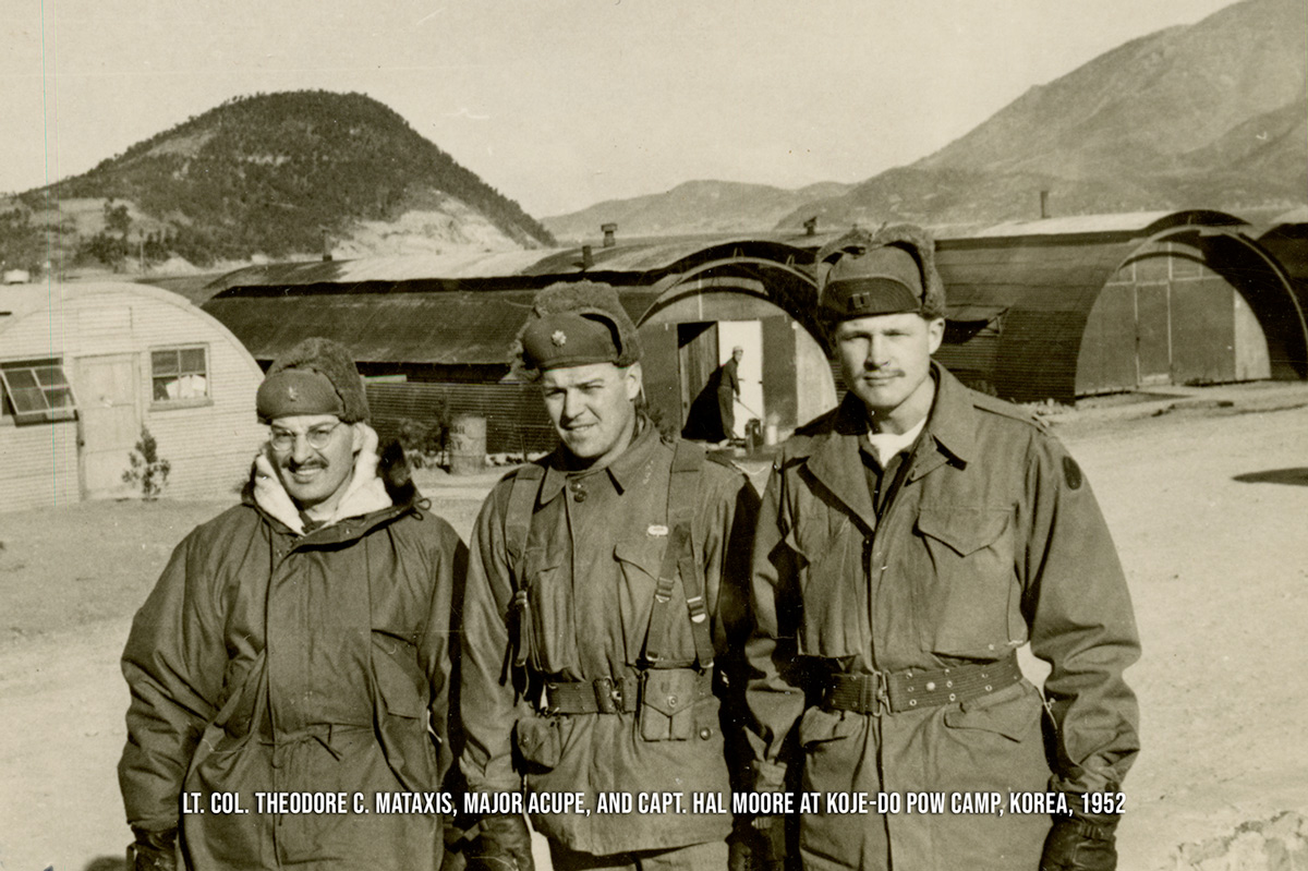 Lt. Col. Theodore C. Mataxis, Major Acupe, and Capt. Hal Moore at Koje-do POW Camp, Korea, 1952