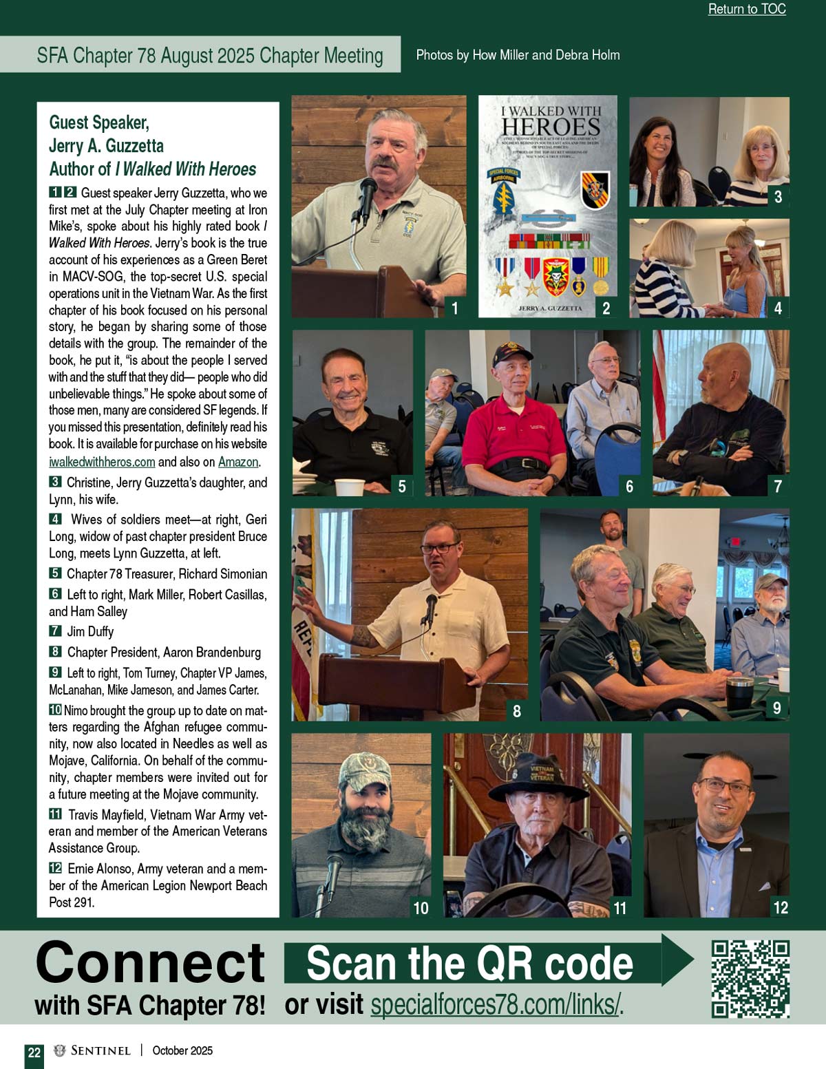 Guest speaker Jerry Guzzetta, who we first met at the July Chapter meeting at Iron Mike’s, spoke about his highly rated book I Walked With Heroes. Jerry’s book is the true account of his experiences as a Green Beret in MACV-SOG, the top-secret U.S. special operations unit in the Vietnam War.