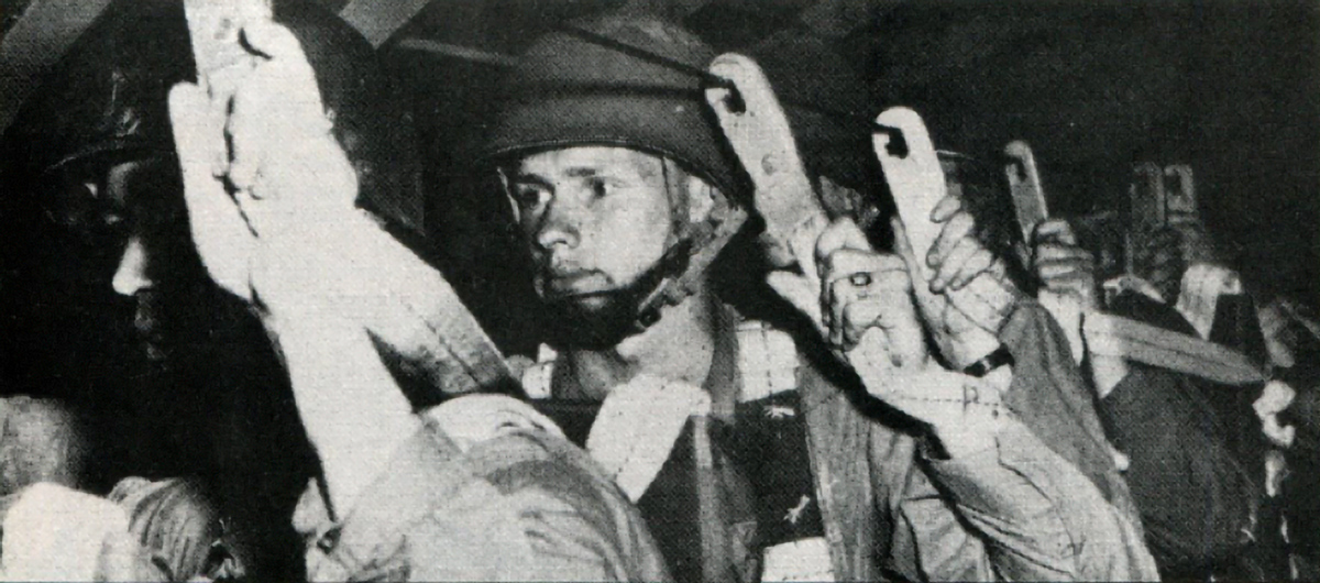 Above, Lt. Singlaub hooked to the static line during Ft. Benning's jump training. (Singlaub Collection).