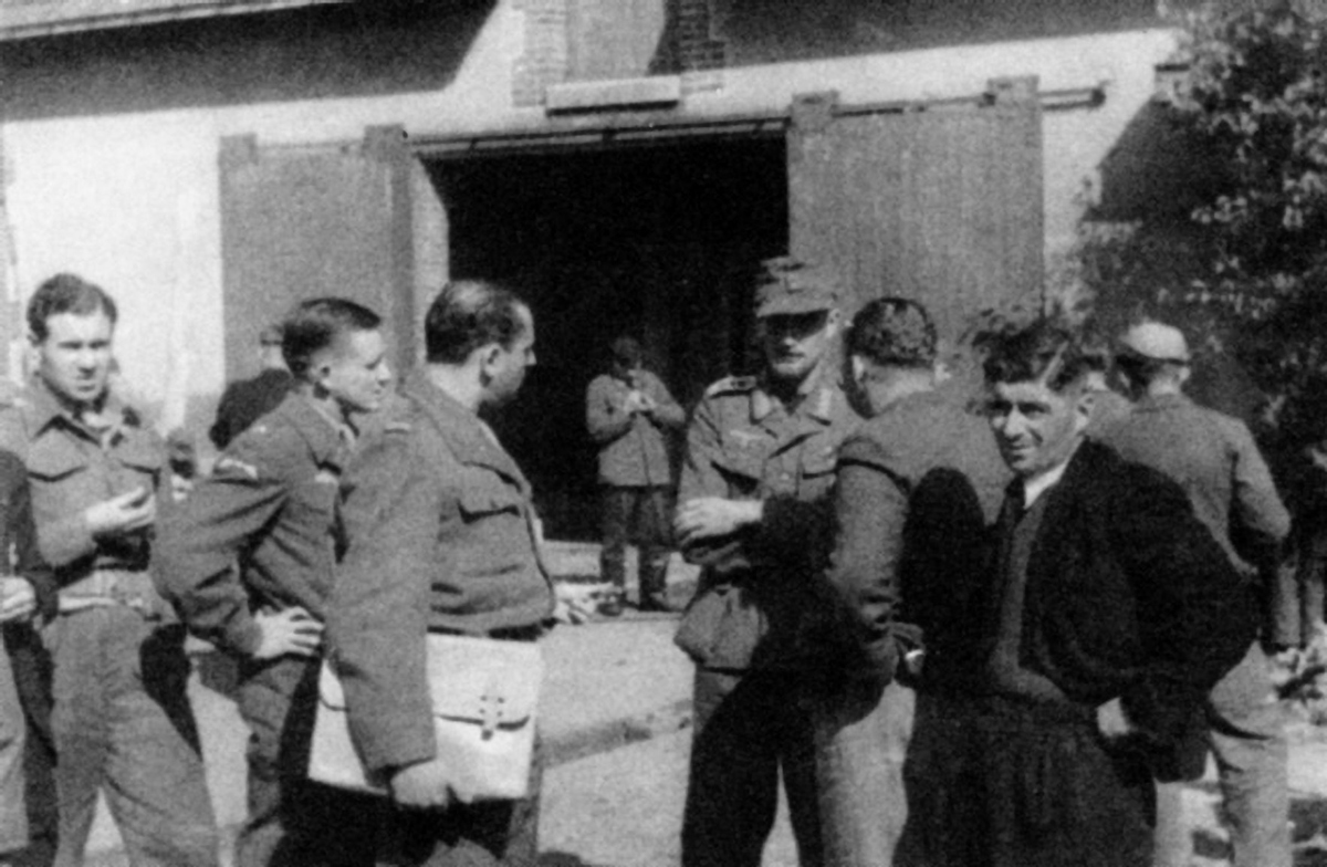 Singlaub (left) and other OSS team members question a captured German, with folded arms. (Singlaub Collection)