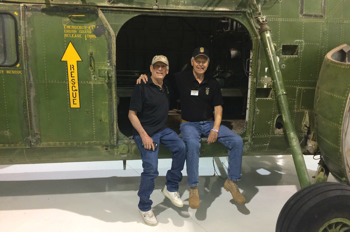The Frenchman and Tilt sit in the door of a Sikorsky H-34 helicopter.