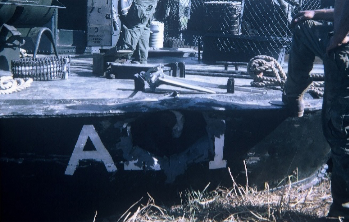Here is a photo taken the next day of one of the boats which almost sank– those direct hits by VC fired B-40 rockets did some serious damage.
