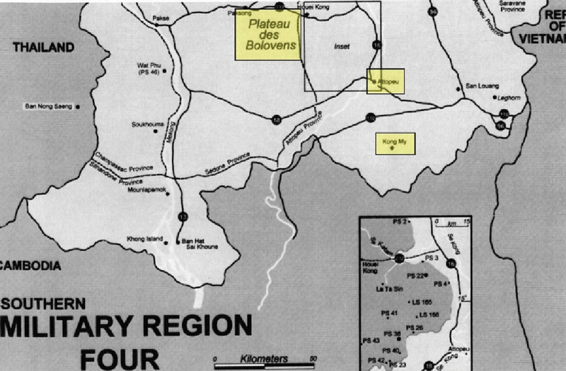 At least that was the mindset as we formed the 46th SFCA at Fort Bragg. It also directed our pre-mission studies to concentrate our B-team’s area of interest on the southern portion of Laos, east of Pakse on the Plateau des Bolovens, a plateau that overlooked the general path of the Ho Chi Minh Trail from the west. Due east of the Plateau at approximately 50 kilometers straight line distance lay the South Vietnam border and its I Corps and II Corps regions. The Fourth Military Region of Laos and especially the Plateau des Bolovens were peppered with CIA training sites, CIA-led special guerilla unit (SGU) garrisons, and technical listening sites to monitor NVA activities and movements. (See figure 2, below)